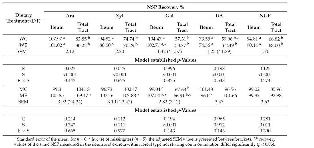The recovery of NSP in the ileum and excreta was determined through the constituting monosaccharides. For that reason, the recovery of xylose, arabinose, galactose, uronic acid, and non-glucosyl NSP (NGP) was estimated using the following equation: