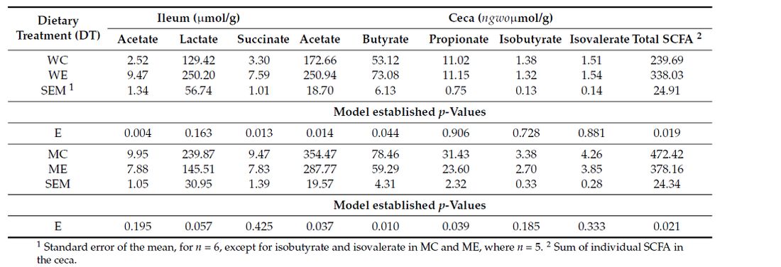 In the wheat-based DT, enzyme addition significantly increased acetate (p = 0.004) and succinate (p = 0.013) contents in the ileum. However, it did not significantly affect lactate contents (p = 0.163), even though the value obtained in WE was 1.9 times higher than in WC. The reason behind the lack of significance could be the high variation in individual values. Furthermore, enzyme addition significantly increased the contents of acetate (p = 0.014), butyrate (p = 0.044) and total SCFA (p = 0.019) in the ceca. No significant influence of enzyme addition was observed in the contents of propionate (p = 0.906), isobutyrate (p = 0.728) and isovalerate (p = 0.881).
