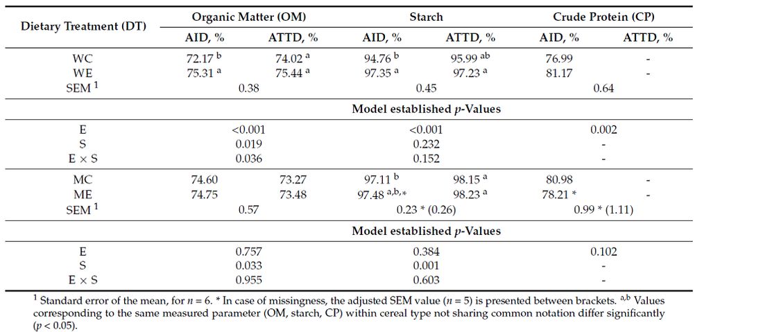 A significant enzyme (E) and sampling site (S) interaction (p = 0.036) was observed only for OM in the wheat-based DT. Firstly, the pair-wise comparison between the OM-AID and ATTD values of WC and WE revealed that WC-ATTD was significantly higher than WC-AID (p = 0.014). However, similar values between WE-AID and WE-ATTD were obtained (p = 0.995). Secondly, WE-AID was significantly higher than WC-AID (p < 0.001). Lastly, WE-ATTD showed a trend to be higher than WC-ATTD (p = 0.074).