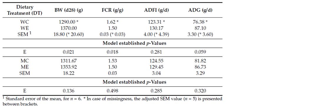 Overall, WE presented increased BW (6% higher, p = 0.021), ADG (14% higher; p = 0.059) and ADFI (6% higher; p = 0.281) values compared to WC, while FCR decreased by 7% (p = 0.018). ME presented numerically positive responses compared to MC, but not to the extent observed in the wheat-based DT. For example, ME presented increased BW (3% higher; p = 0.136), ADG (6% higher; p = 0.320) and ADFI (4% higher; p = 0.285) values compared to MC, while FCR was decreased by 2% (p = 0.498).