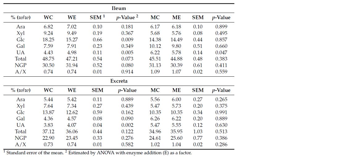 In maize-based DT, the sampling site significantly influenced the Gal (p < 0.001) and NGP (p = 0.011) recovery values, with lower values being obtained in the total tract compared to the ileum. On the contrary, there was no significant effect of sampling site on Ara (p = 0.743), Xyl (p = 0.111) and UA (p = 0.912) recovery. The ileal and total tract recoveries of Xyl, Ara, and UA were similar, fluctuating around 100% of the constituent monosaccharides present in the diet. No significant effect of enzyme addition was observed in all cases (p > 0.05).
