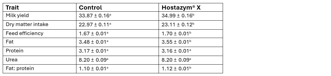 In an in vivo study conducted in Mexico (Higalgo et al., 2025) under heat stress conditions, Hostazym® X was supplemented to treated animals at a rate of 9000 EPU/kg DMI (dry matter intake). The dairy cows were fed a typical total mixed ration (TMR) based on corn silage, corn grain and soybean meal between June and October, with total heat allowance (THA) reaching above 75 during the study. Hostazym® X helped improve feed efficiency, feed intake, milk production, and milk fat during the trial (Table 1).