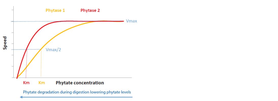 However, as indicated in Figure 1, two phytases having a similar Vmax can have lower speed of action when phytate levels decrease due to the action of the phytase. This is due to a difference in affinity (Km) of the phytase for phytate. The affinity, defined as the concentration of phytate at which the speed of its degradation equals half of its maximal speed, indicates how long this high speed can be maintained when the phytate concentration is decreasing. A low Km (so a high affinity) gives a benefit to a phytase as it will lead to a prolonged high speed of phytate degradation, and thus a higher P matrix value measured in vivo can be expected.