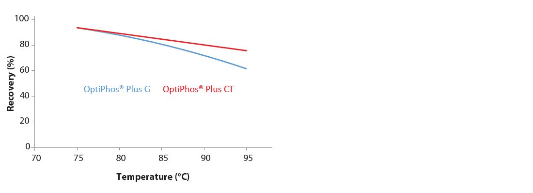 In the period 2017-2020, plural pelleting trials in Europe (at five different trial locations) and in the USA (at five different trial locations) were conducted to assess the heat stability of a newly developed intrinsic heat stable phytase, either uncoated (granular) as well as the coated version. It was chosen to run these trials in different trial locations, so that the phytase was tested under a wide variety of different pelleting conditions (including impacting factors like equipment, feed composition, speed of cooling and others). As the universal definition of stability states that "stability is achieved when recovery of the active substance is > 80% of the original value", it can be seen that the newly developed phytase can claim an intrinsic heat stability of 85 oC (Figure 2) when applied in the granular form (G), while its coated version (CT) can stand pelleting temperatures up to 90 oC and even 95 oC with acceptable (25%) losses of activity (Figure 2).