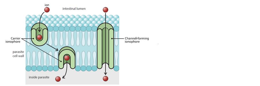 The introduction of ionophore anticoccidials in the 1970s proved to be critical for the development of modern poultry production. Ionophores interact with ion transportation within the parasite, hence their name which is derived from the Greek 'ion phoros', meaning 'ion carrier'. Ionophores transport ions (e.g. sodium (Na+), potassium (K+), hydrogen (H+) etc.) across hydrophobic membranes, in this case, the parasite wall (Figure 1). This increases the concentration of these ions inside the parasite, eventually resulting in the uptake of water through osmosis causing the parasite to swell and burst.