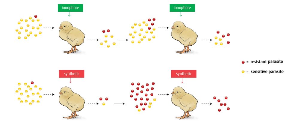 One of the main characteristics of an ionophore product is the slow selection for resistance. Some parasites will always escape the effect of the product, known as 'ionophore leakage'. This is an inherent property of all ionophores, linked to their mode of action. The consequence is that, besides the parasites with reduced sensitivity, some completely sensitive parasites will survive the effect of the ionophore. The competitive advantage for the resistant parasites is less pronounced and the shift to an increasingly resistant parasite population is a much slower process in comparison to synthetic compounds (Figure 2).