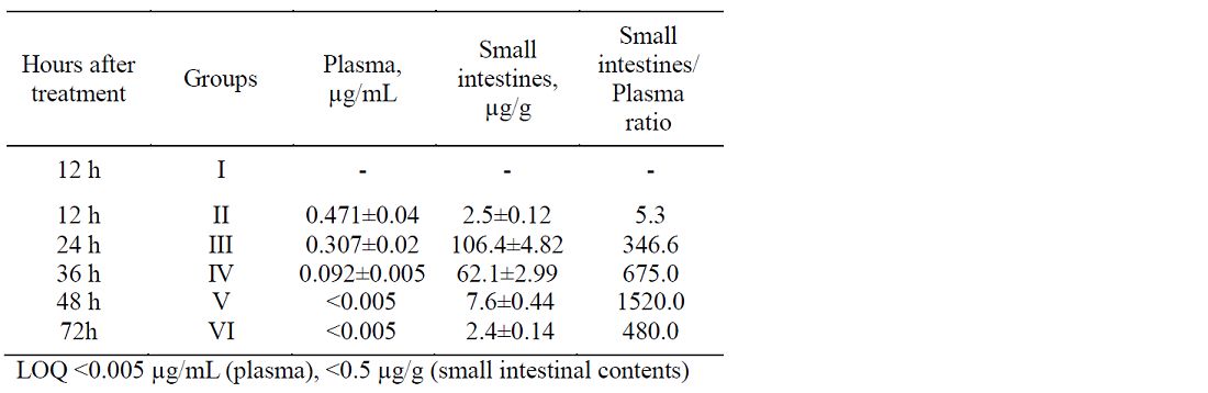 The concentrations of FBZL in the plasma and in the small intestinal contents 12 hours after treatment were 0.471±0.04 μg/mL and 2.5±0.12 μg/g, respectively (Table 1). Twenty four and 36 hours after treatment, FBZL concentrations in the plasma were lower as compared to those found 12 hours after treatment. Concentrations of FBZL were found in the small intestines contents from 12 hours to 72 hours after treatment, the higher concentration of 106.4±4.82 μg/g being found 24 hours after treatment.