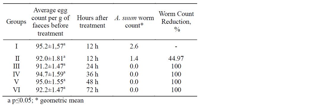No statistically significant difference was found in the A. suum egg counts in the faecal samples of the pigs of all groups before treatment (Table 2). When included in the feed of infected pigs (II-VI) at a dose of 5 mg/kg BW, FBZL led to statistically significant decrease in the A. suum worm counts in the small intestines. Worm Count Reduction was 44.97% 12 hours and 100% from 24 hours to 72 hours after treatment.