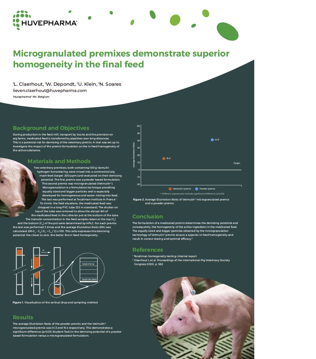 Medicated feed is often transported and transferred over long distances in trucks and then through pipelines. During this movement, there is a potential risk of demixing. The unique microgranulation technique used to produce Huvepharma's premixes results in equally sized and bigger particles, ensuring superior homogeneity of the active compound in feed compared to simple powder formulations.
