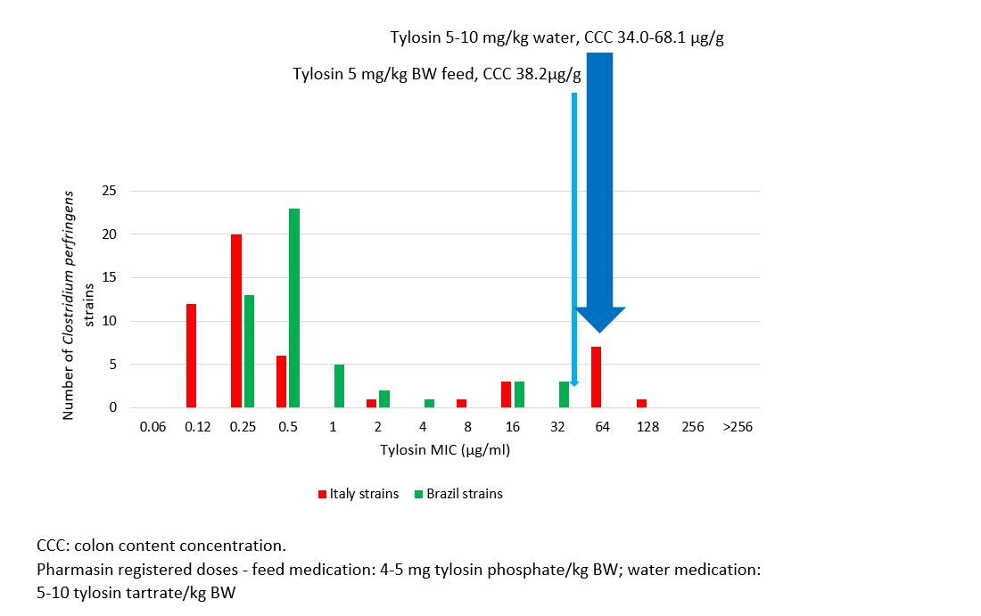 In pharmacokinetic studies following oral administration, similar tylosin concentrations in the colon were achieved by in-feed and water administration at the same dose levels. As shown in Figure 6, tylosin colon content concentrations (CCC) following Pharmasin® / Tylovet® oral administration at a therapeutic dose exceeded the MIC values of all tested Clostridium perfringens strains from Brazil and 85% of the tested C. perfringens strains from Italy.
