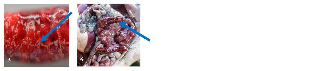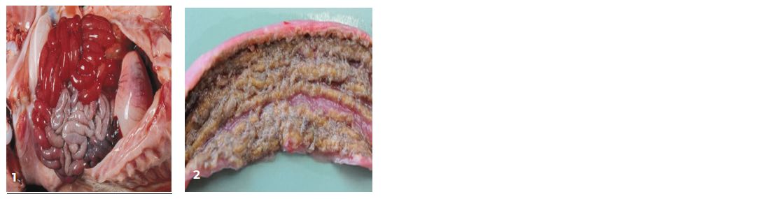 Necrotic enteritis (NE) in pigs can lead to significant economic losses on pig farms due to mortality rates up to 100%. The infection is caused by Clostridium perfringens (CP) and is highly prevalent in pig herds worldwide. Figures 1-4 show images from pigs affected by NE.