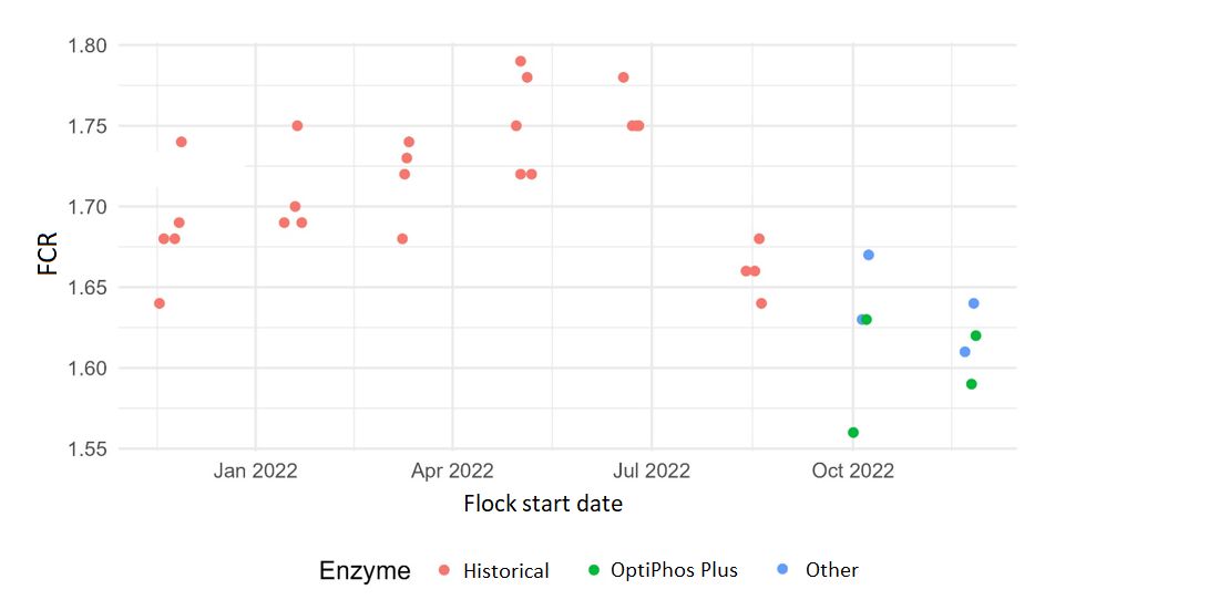 In the summer of 2022, broiler diets were renovated completely to improve the cost of production. Optimised feeds were nutritionally richer yet less costly than the original diets, containing more metabolisable energy and digestible lysine, less calcium and more available phosphorus (P). Reformulation was facilitated by Huvepharma's digestibility enhancers Hostazym® X (a fibre-degrading enzyme) and OptiPhos® Plus (a phytate-degrading enzyme).