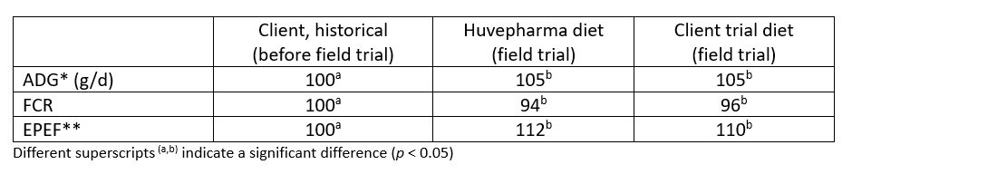 Table 1 summarises the improvements in feed conversion rate (FCR), average daily gain (ADG) and European Production Efficiency Factor (EPEF, an equation based on average daily weight gain, mortality and feed conversion) when birds were fed the renovated diets versus the historical or trial diets. The Huvepharma diets tended to improve EPEF (+ 5 points) and FCR (- 4 points) compared to the client trial diet (not significant due to small sample size).