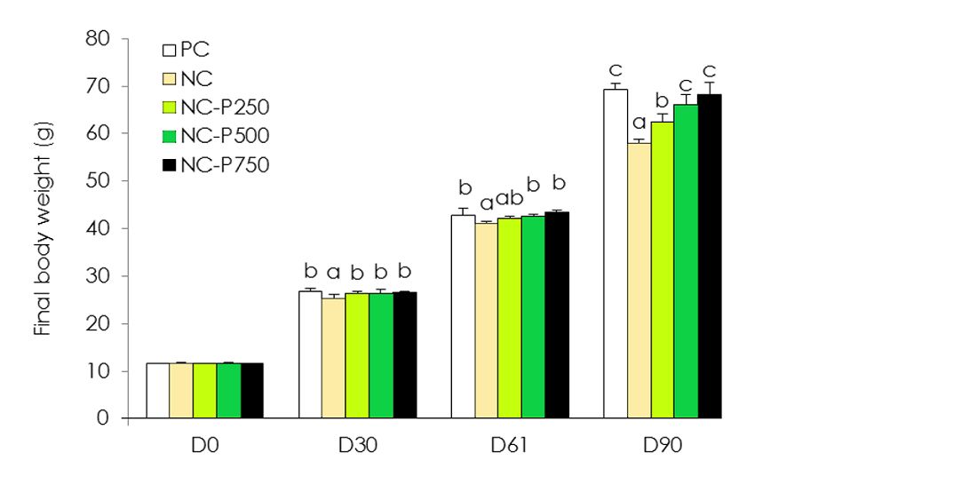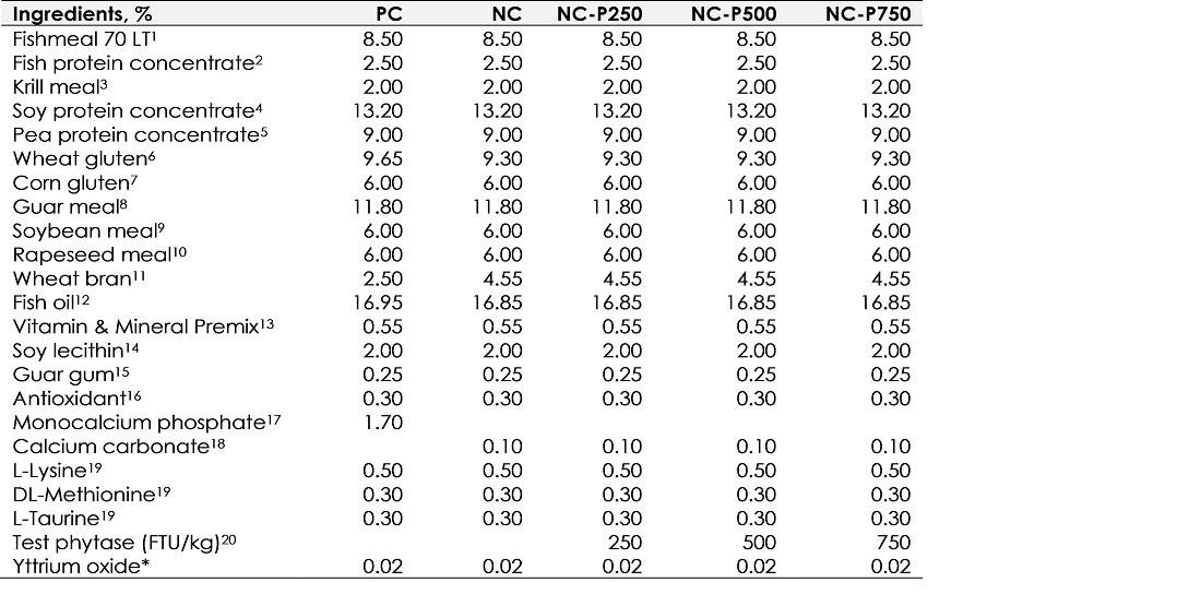 - Positive control (PC) with 1.14% P (1.7% mono calcium phosphate (MCP) in the feed formula); 0.48% phytate-P