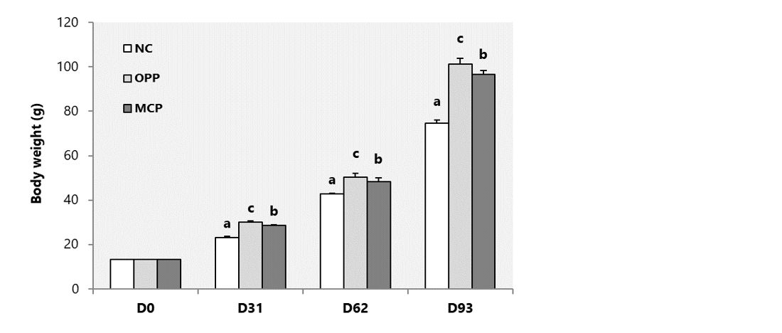 - Final weight achieved with OptiPhos Plus was significantly higher than the weight observed for the negative control group as well as the group that received the treatment with MCP.