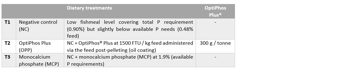 The results obtained (Table 3) show that, when using OptiPhos Plus at 1500 FTU/kg feed, the final body weight (FBW), PER and SGR were significantly higher (p < 0.05) than the treatment containing monocalcium phosphate (MCP). The treatment with OptiPhos Plus at 1500 FTU/kg feed also showed a higher FBW, PER and SGR than the negative control (NC) group (p < 0.05).