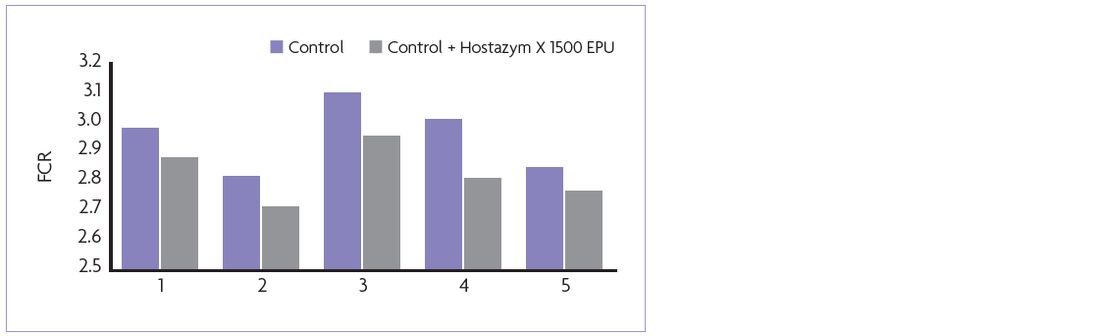 Results (Figure 1) show that Hostazym® X has a consistent response in reducing FCR, independently of diet fed (and the fibre structure in it). The contribution of Hostazym® X to better pig performance and optimal production efficiency can be explained by four main actions:
