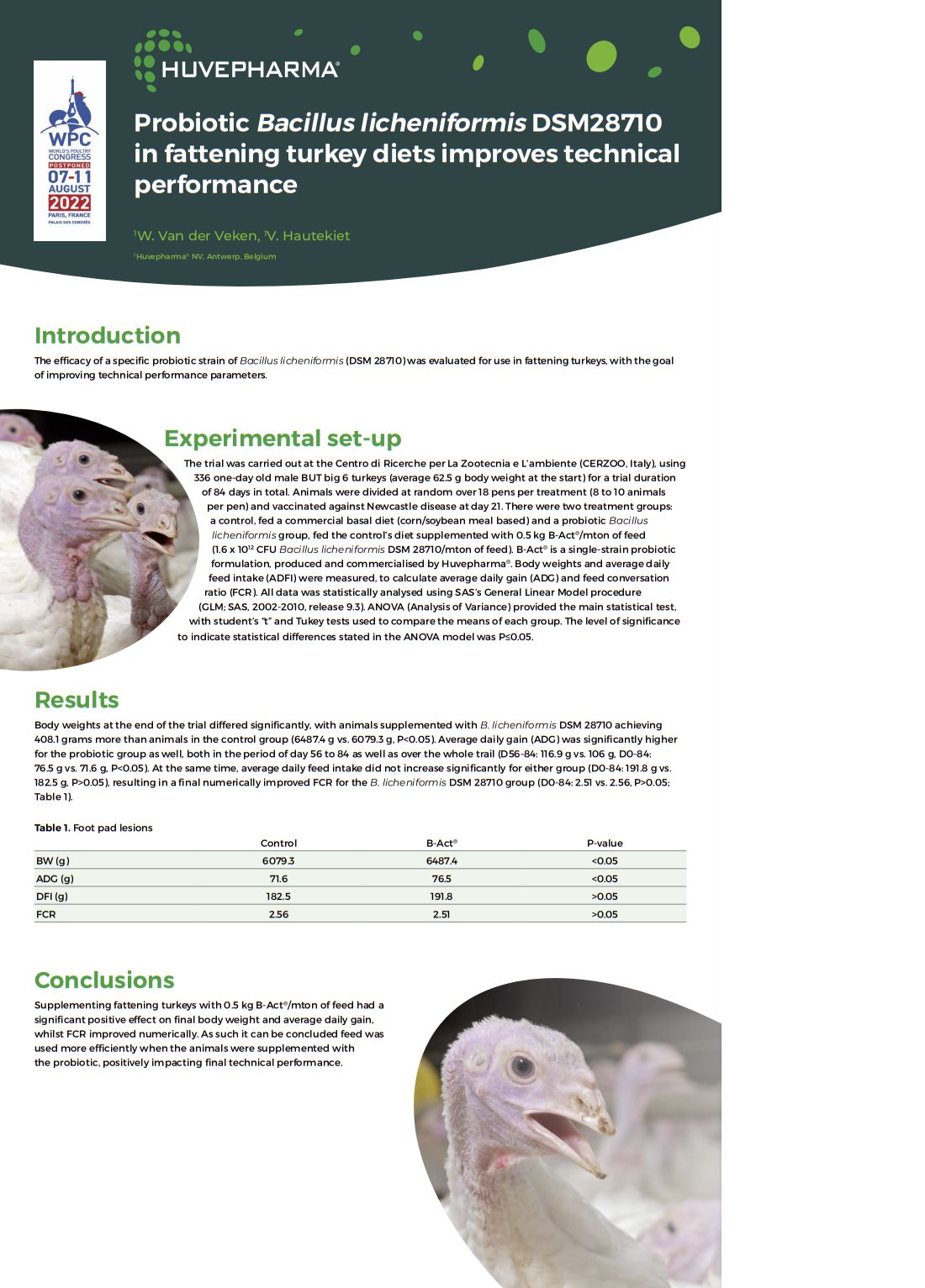 Supplementing turkey diets with the probiotic B-Act® significantly improves zootechnical performance parameters including body weight and average daily gain.