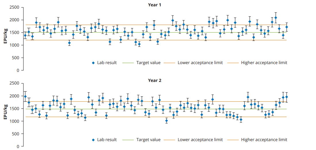 Control charts are a basic quality assurance tool for monitoring results and process variations, to decide on product conformity, identify trends and annual variances and, in this case, to validate that the enzyme is stable under the processing conditions of that specific production unit.