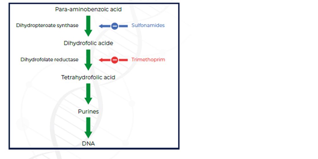 Sulfonamide and trimethoprim combinations act by targeting two sequential steps in the biosynthesis pathway for tetrahydrofolate (THF) as shown in Figure 1. The combined activity results in synergistic effects and increasing efficacy against different bacterial pathogens.