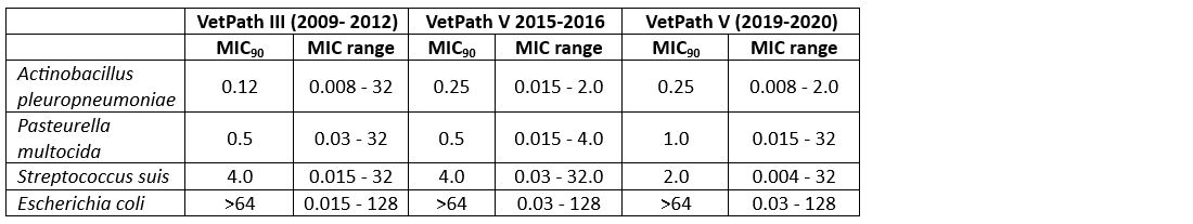 Over a period of 12 years, similar susceptibilities were determined with no trend in minimum inhibitory concentration (MIC) changes. High susceptibilities were determined in the case of tested respiratory pathogens (A. pleuropneumoniae, P. multocida, S. suis). Low susceptibility was identified for Escherichia coli strains. The bacteria strains originated from eight different European countries.