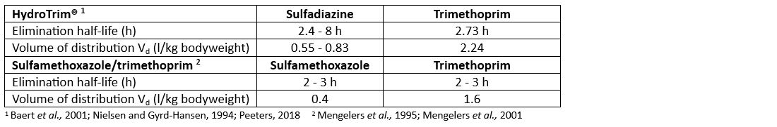 - Pharmacokinetic properties are in favour of HydroTrim sulfadiazine/trimethoprim. This justifies the therapeutic use of HydroTrim as first preference in pig farms vs. other sulfonamide/trimethoprim combinations.
