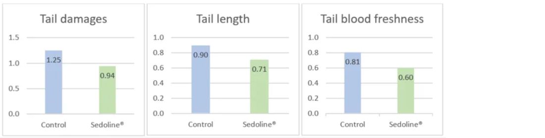 272 healthy pigs with long, uncut tails and teeth cut on day 1 after birth were allocated to two groups of 136 piglets each for a blind test with pelleted feed. One was a control group, and the other group received the same control feed but supplemented with Sedoline® Powder at 1 kg per tonne feed from weaning at day 28 (7-8 kg) until day 70 (25-29 kg).