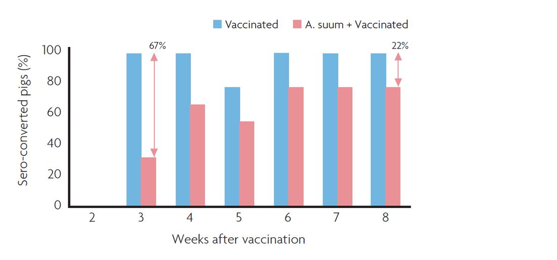 The impact of a concurrent A. suum infection on the response to a Mycoplasma hyopneumoniae vaccination and a subsequent artificial M. hyopneumoniae challenge was investigated. Concurrent worm infections lowered the sero-conversion three weeks after M. hyopneumoniae vaccination by 67% (Figure 1).