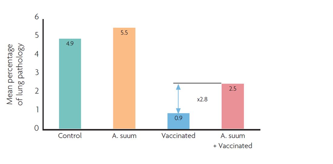 When challenged, vaccinated pigs infected with A. suum showed three times more severe lung pathology compared to vaccinated pigs without worm exposure (Figure 2). The economic benefit of a strategic deworming programme is estimated to be up to €9 per fattening pig.
