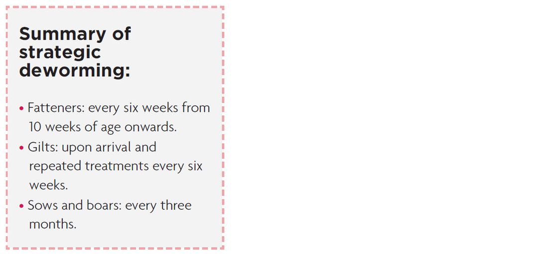Repeated treatments batch after batch are needed to lower the infection pressure in fattening units. Optimal results can only be achieved with molecules active against all different helminth stages (eggs, intestinal and migrating larval stages and adult worms).