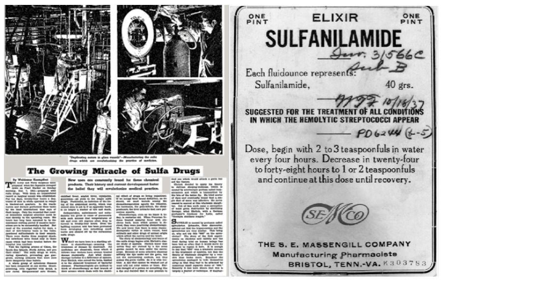 Initially, sulfonamides were mainly used in the dye industry until in 1932 a Bayer chemist (Josef Klarer) discovered that a certain red dye had a remarkable effect on stopping bacterial infections in mice. The result was a 'sulfa craze' (Figure 1), hundreds of manufacturers started to produce al kinds of sulfonamides without any testing requirements. This led to the introduction of the Federal Food, Drug and Cosmetic Act in 1938 in the United States, forcing manufacturers to submit evidence of new drugs' safety and effectiveness before marketing and distribution.