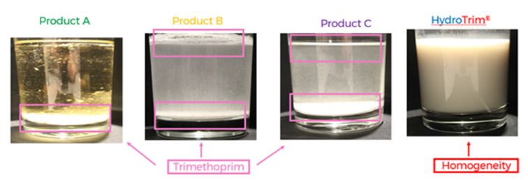 - Develop a nanosuspension. Trimethoprim is not soluble enough - it has a maximum solubility of 0.4 mg/ml, while 5 mg/ml is the required dose for stock solutions. To overcome this, Huvepharma developed HydroTrim® which contains nanonised trimethoprim that stays in homogenous suspension, even at very high concentrations.