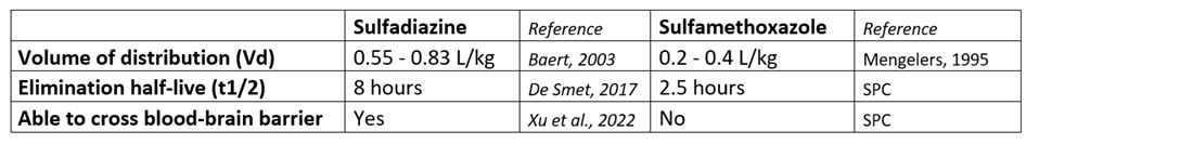 In livestock production, several sulfonamides are being used, such as sulfaximethoxine, sulfadiazine, sulfamethoxazole, sulfamethazine, sulfaquinoxaline, sulfathiazole, sulfamerazine, sulfasalazine, and sulfachloropyridazine, mostly in combination with trimethoprim, due to its synergistic effect. Sulfonamides/trimethoprim are being classified in the EMA categorization (published 28/01/2020) as Category D, which means they should be used as a first line treatment in livestock. It is important to know that the various sulfonamide derivatives differ in their pharmacokinetic properties (Table 1). Typical differences are their ability to penetrate tissues (Vd, volume of distribution) and elimination half-time (t1/2).