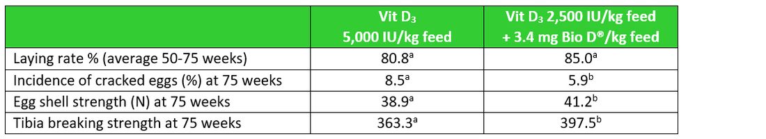 To avoid the risks described above, supplementing the diet with 25-hydroxyvitamin D3 offers a solution, aiming to support the animal at all stages of lay and positively impacting calcium regulation. The metabolite is part of the normal vitamin D pathway, but does not rely on the liver and fits with the animal's natural feedback mechanism based on vitamin D levels. To examine the efficacy of a commercial 25-hydroxyvitamin D3 supplement, different studies have been conducted with Bio D®. The product is a source of 25-hydroxyvitamin D3, produced via fermentation, which positively impacts the stability and bioavailability of the 25-hydroxyvitamin D3. Table 1 shows the summarized results of a trial with 75-week-old layers (Lohmann Brown).