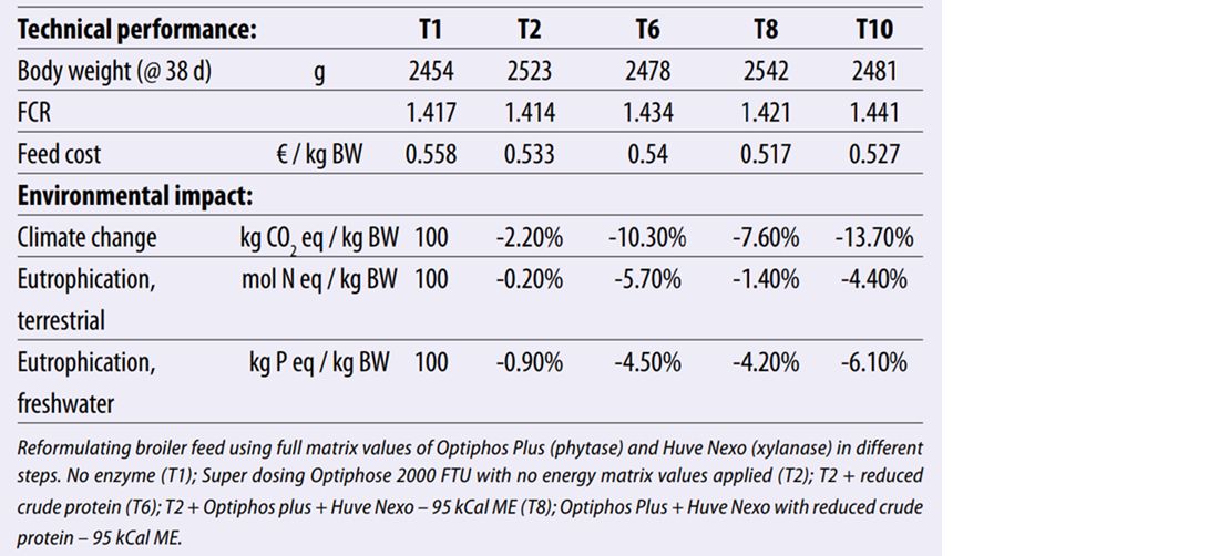 Table 1 presents the results of a broiler trial where the feed ration was reformulated using full matrix values for the Huvepharma enzymes to reduce the production cost and the environmental impact. The objective of the trial was to reformulate the feed to reduce the environmental impact of broiler production but maintain technical results. Ingredients were priced at local market price at the time of the trial and serve as an indication.