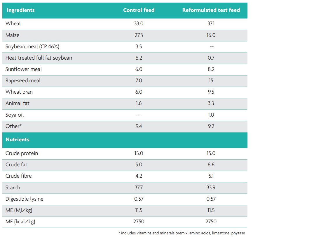 - Reformulation - control feed reformulated to the same nutritional specifications by replacing soybean with sunflower meal, rapeseed meal and wheat bran