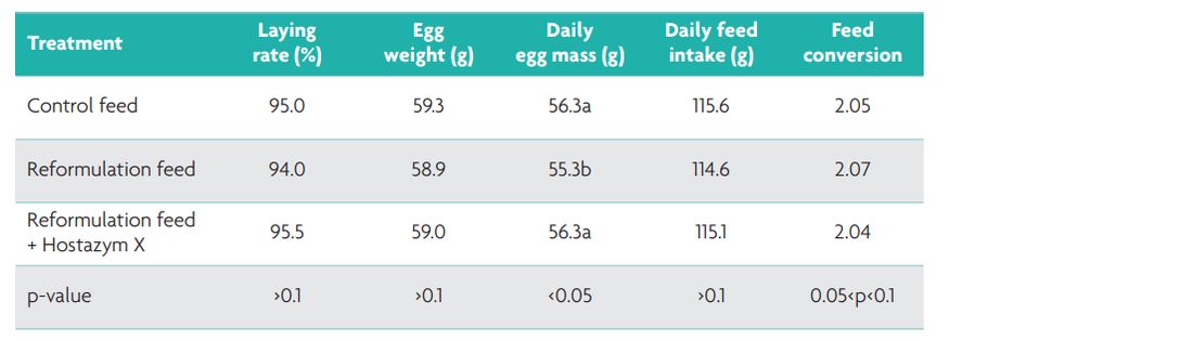 The results, as shown in Table 2, clearly show that when control feed is reformulated, the technical performance drops; laying rate drops by 1.5%, egg mass by 1.3 g and feed conversion ratio increased by four points. However, when the reformulated feed is supplemented with Hostazym X, performance parameters are brought back to the level of the control feed.