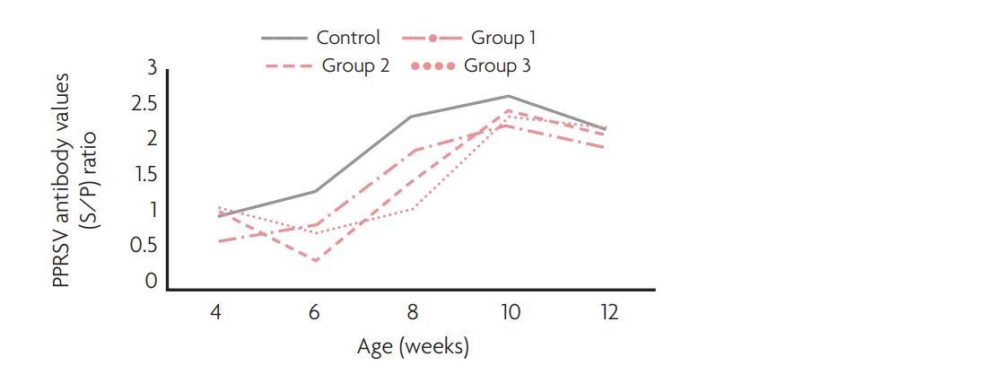 PRRSV infection was found at 4 and 6 weeks of age at a low percentage of pigs in Group 1 (10 - 15%), Group 2 (0 - 5%) and Group 3 (0 - 25%) in comparison to the control pigs (30 - 65%).