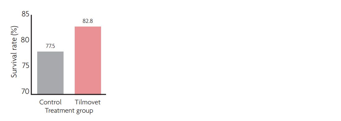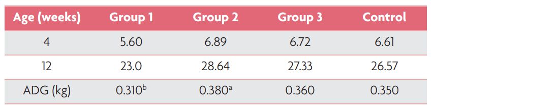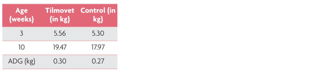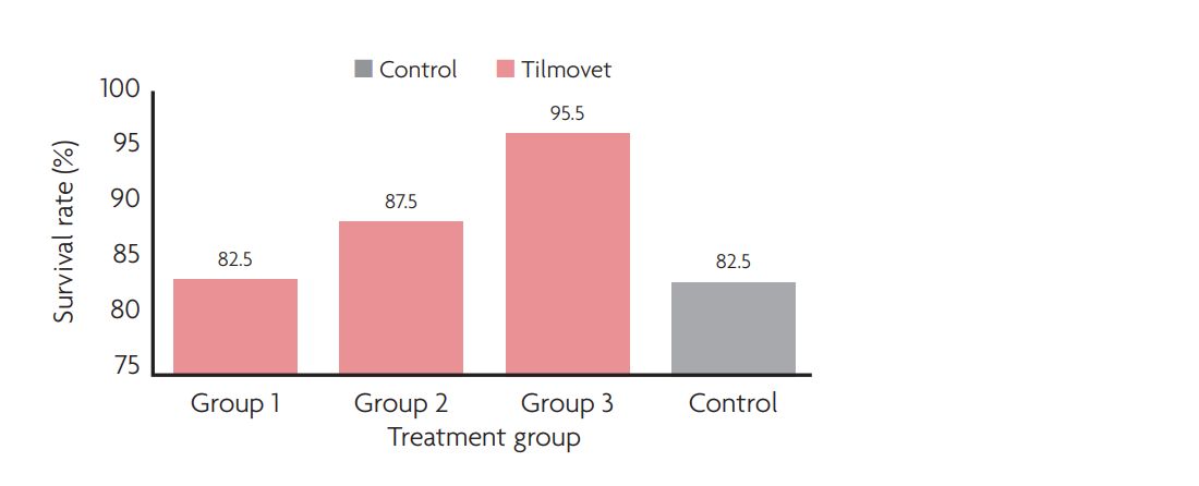 Tilmovet® treated pigs in Groups 2 and 3 exhibited a higher survival rate of 87.5% and 95% vs 82.5% in the control group (Figure 2), and a better weight gain of 0.380 kg and 0.360 kg, respectively, in comparison to the pigs in the control group (0.350 kg; Table 1).