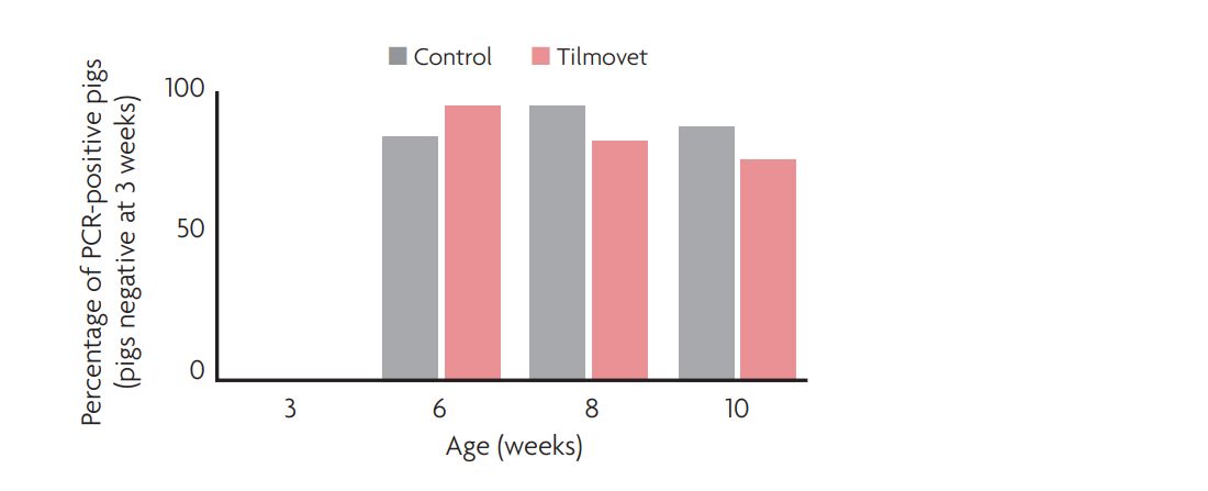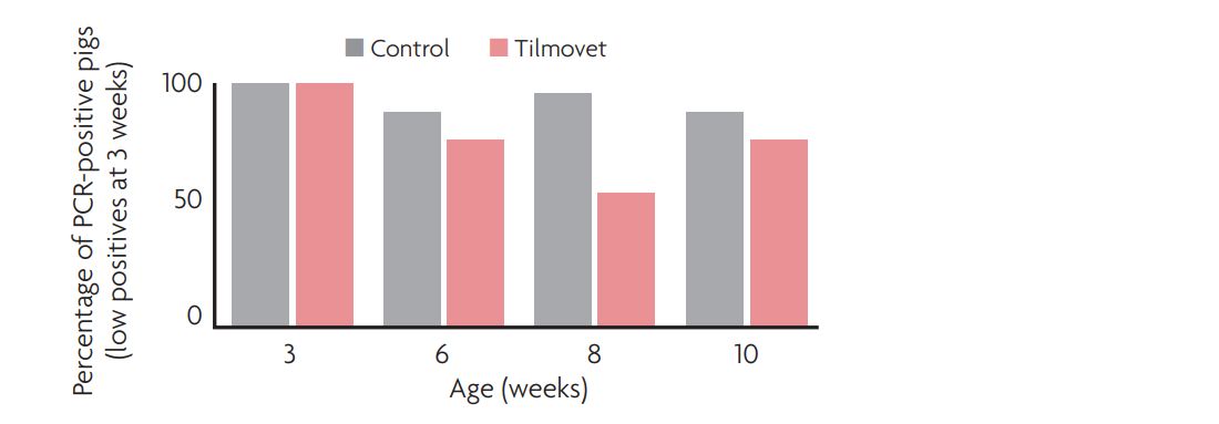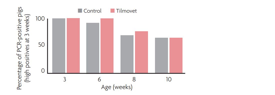 In high level PCR-positive pigs at the beginning of the study, a similar infection reduction by 25% at 8 weeks of age and 40% at 10 weeks of age in the Tilmovet® group vs the control group with 29% at 8 weeks of age and 40% at 10 weeks of age was found (Figure 5).