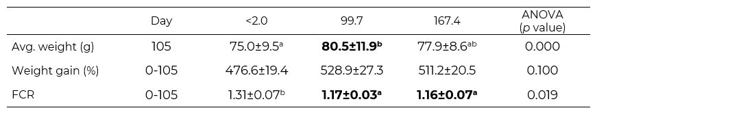 Fish had a total weight gain of up to 528.9 ± 27.3 (%) at the end of the trial, although this was not significantly different between treatments (Table 2). The lowest FCRs were observed in the fish fed diets containing Bio D, also leading to better feed performance.