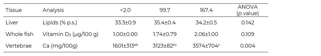 An increase in vitamin D3 content in the fish was observed associated with the increase in Bio D in the diet. The calcium content in the vertebrae increased to the level of 99.7 and 167.4 ppb (Table 3). Better calcium retention plays a key role in skeletal mineralisation and is linked with bone strength and growth in fish.