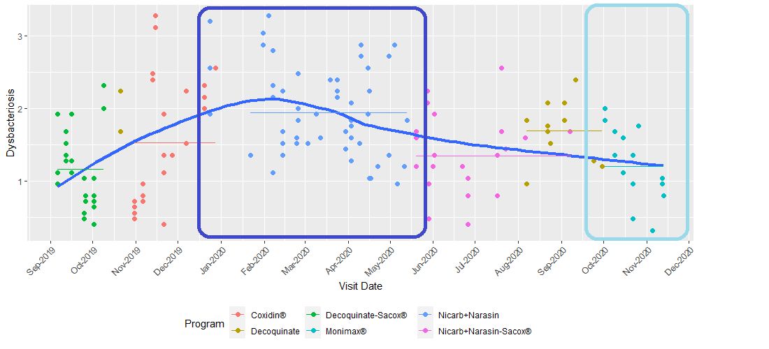 Analyzing gut health data over time allows for a comparison of the different coccidiostats programs (Figure 1).