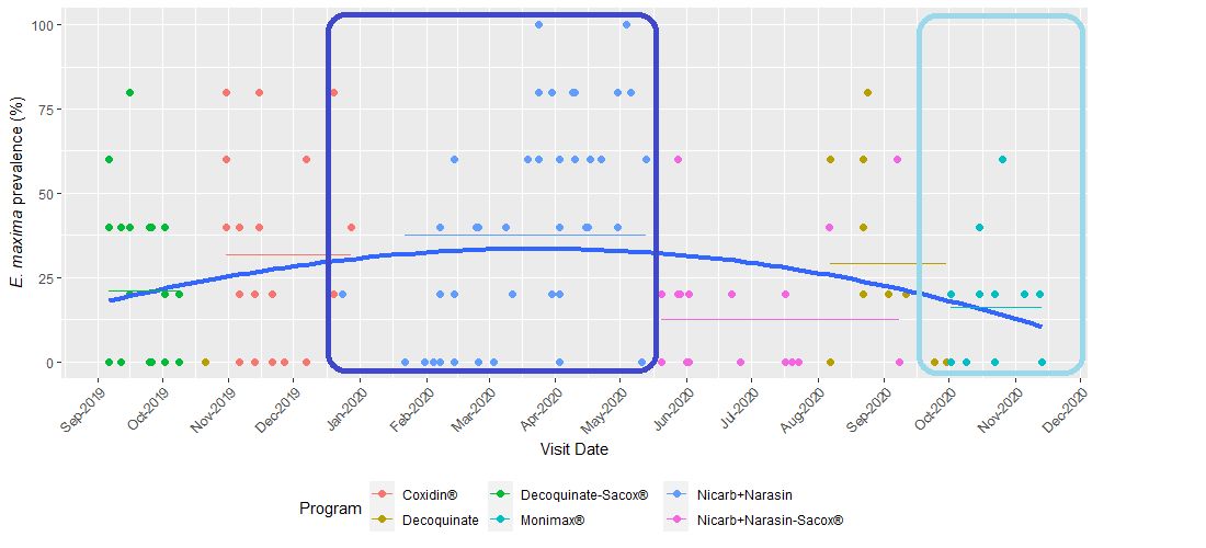 When looking in more detail at the coccidiosis scores over time, differences in the Eimeria maxima prevalence were noted (Figure 2).