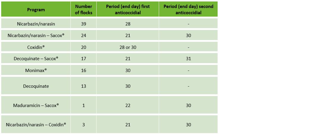 The most frequently used programs, before the introduction of Monimax® to the Polish market, were a full nicarbazin/narasin program (39 flocks), a shuttle with nicarbazin/narasin followed by Sacox® (24 flocks) or a full Coxidin® program (20 flocks). When Monimax® was launched in 2020, the Polish integrator switched to this new coccidiostat product as they were experiencing some underlying coccidiosis issues.