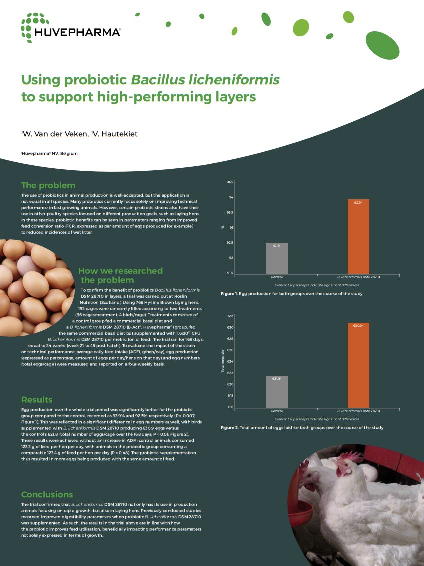 Probiotics are commonly included in diets to increase technical performance parameters in fast-growing animals. However, they are also valuable to use in other poultry species such as laying hens. A study conducted in Scotland found that layers fed a diet with the probiotic B-Act® had significantly better egg production compared to a control group, without an increase in average daily feed intake.