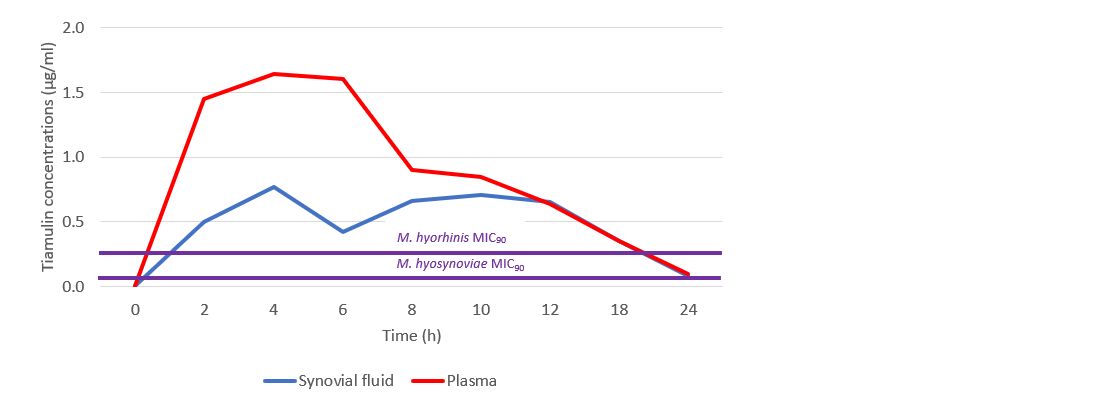 Vetmulin® / Rodotium® provides high tiamulin concentrations in the synovial fluid of joints and in plasma following a single injection
