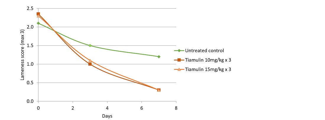 Forty young gilts seriously affected with M. hyosynoviae arthritis were injected for 3 consecutive days with 10 or 15 mg tiamulin hydrogen fumarate/kg body weight/day. Over 7 days, the treated pigs showed a significant reduction in lameness score (Figure 2; < 0.01) and had significantly better weight gain in comparison with the untreated control group.