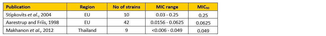 Tiamulin MIC (minimal inhibitory concentration) values of globally isolated M. hyosynoviae and M. hyorhinis strains have been generated and published (Tables 1 and 2). These publications demonstrate low tiamulin MIC90 values and indicate an excellent sensitivity to Vetmulin® / Rodotium® in vitro.